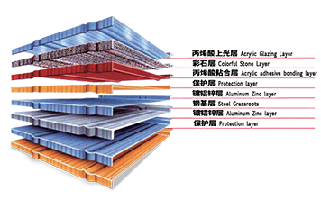 彩石金屬瓦,采用特殊工藝技術生產制造,以防腐性能優異的耐指紋鍍鋁鋅鋼板為基板,以水性丙烯酸酯為粘合劑,以彩色燒結玄武巖為面層裝飾,再以耐候性極強的丙烯酸樹脂為保護層的優質金屬屋面材料。其美觀、輕質、耐用、環保,近年來已經成為國際屋面材料的主流產品,國內高檔建筑使用。>